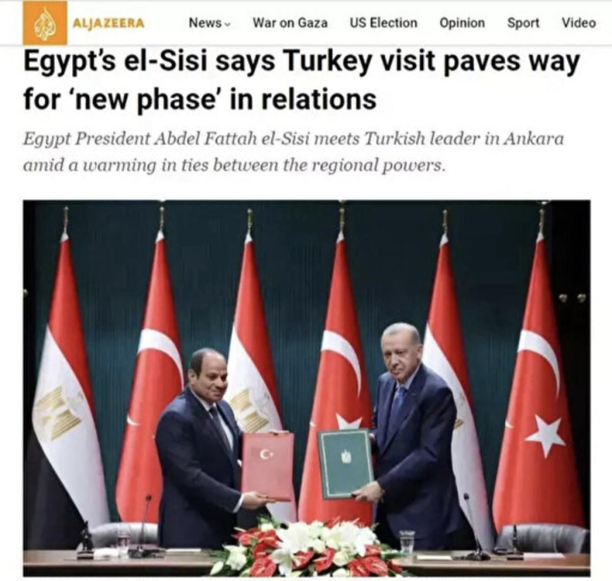 Al Jazeera, Mısır Cumhurbaşkanı Abdulfettah es-Sisi'nin, kendi ülkesi gibi bölgesel bir güç olan Türkiye ile bağların yeniden inşası için Ankara'ya gittiğini yazdı.