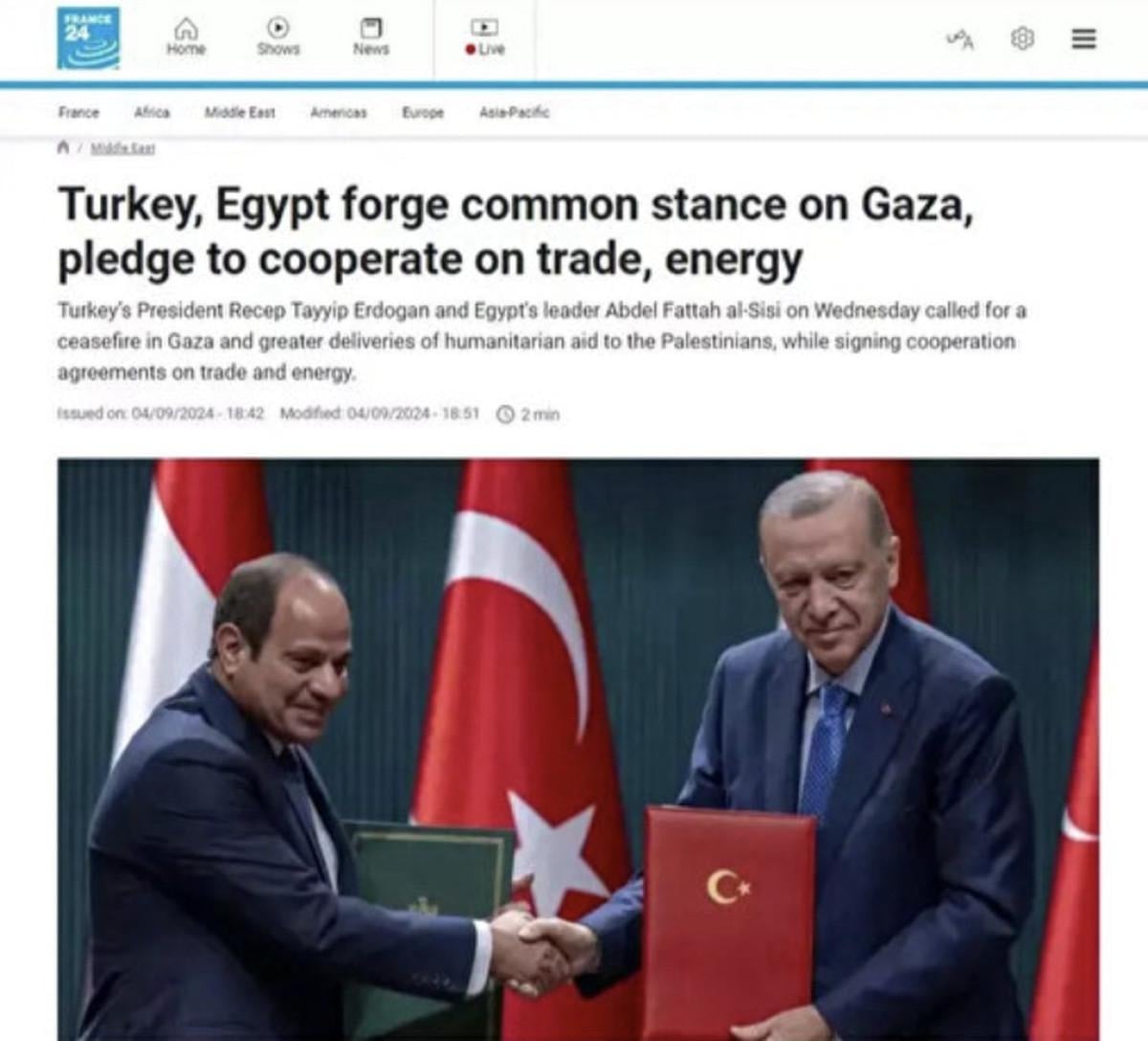 France24, Türkiye ve Mısır'ın Gazze konusunda ortak bir tavır benimsediğini vurguladı.