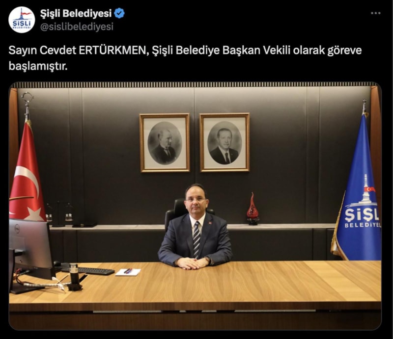 Terör suçlamasıyla tutuklanan CHP'li Resul Emrah Şahan'In görevden uzaklaştırıldıktan sonra yerine kayyum atanan Şişli Kaymakamı Cevdet Ertürkmen'in makam odasından bir paylaşım yapıldı.