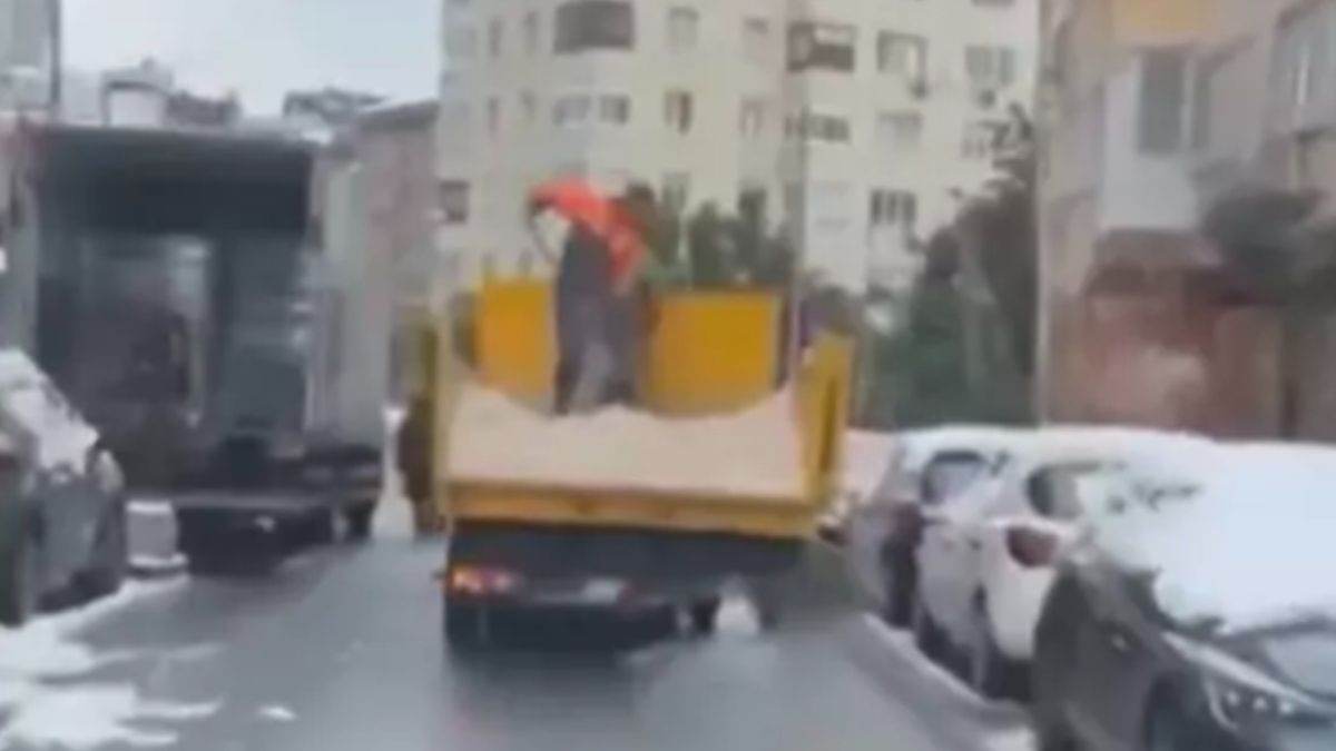 BELEDİYE PERSONELLERİ TUZU ARAÇLARIN ÜZERİNE DÖKTÜ