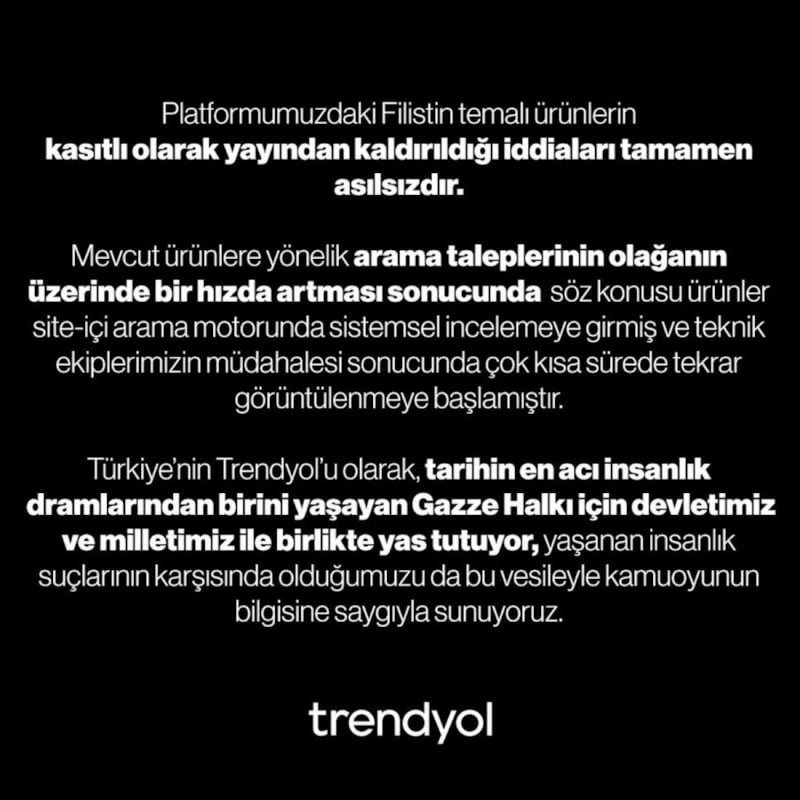 Trendyol, Filistin temalı ürünlerin kasıtlı olarak yayından kaldırıldığı iddiasının gerçeği yansıtmadığını belirtti.