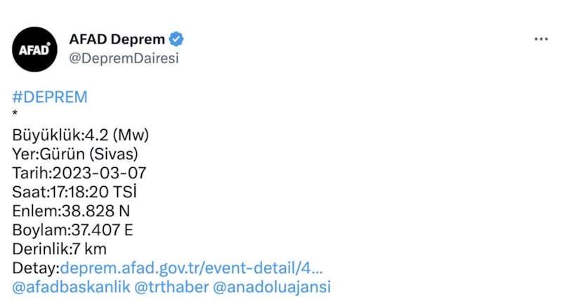 AFAD, Sivas Gürün'de derinliği 7 km kilometre olan 4.2 büyüklüğündeki depremi duyurdu.
