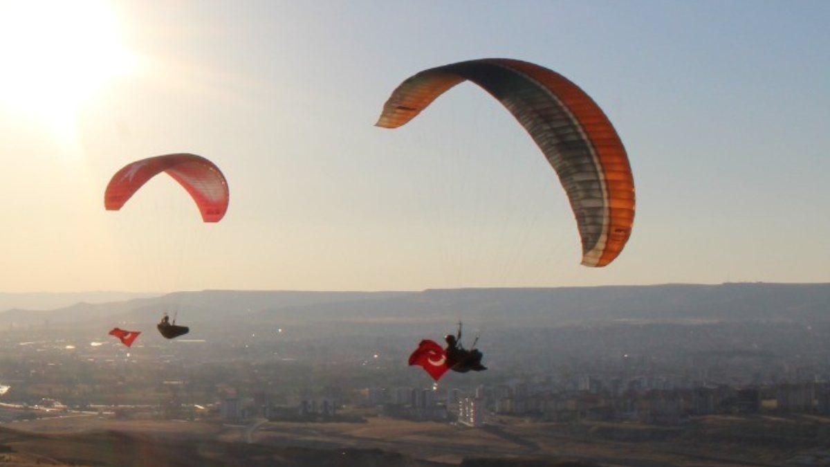 Kent merkezine uzaklığı 5 kilometre olan Bayrak Tepede düzenlenen etkinlikte sporcular Zafer Bayramı’nı paraşütle atlayarak havada kutladı.