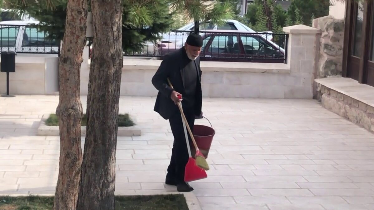 Sivas'ta Altınyayla ilçesinde yaşayan 85 yaşındaki Turan Dalyan, ilçede bulunan Altınyayla Merkez Camii'nin bahçesini her gün gönüllü olarak temizliyor.