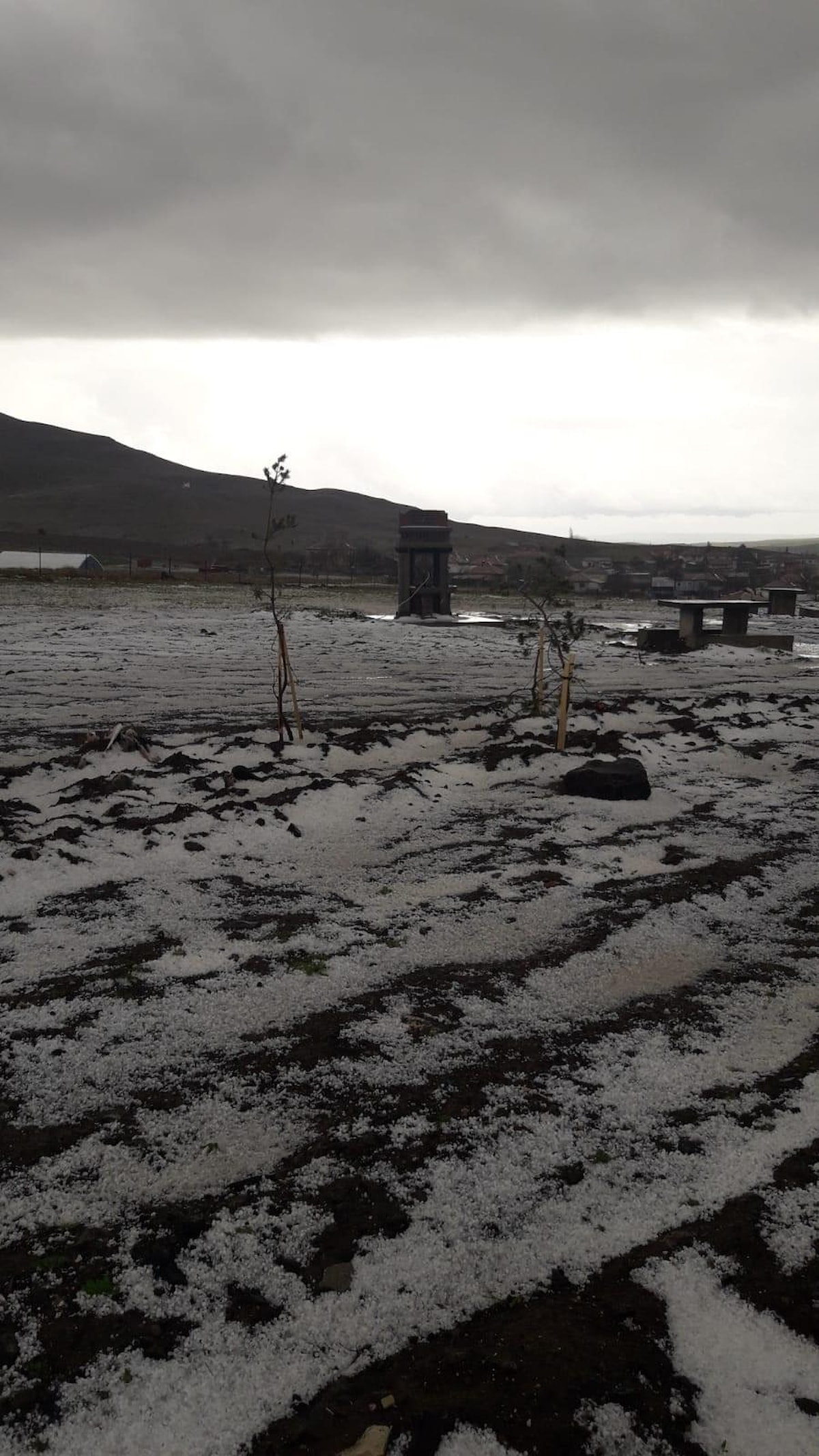 Bir anda yağan dolu adeta köyü beyaza bürüdü.