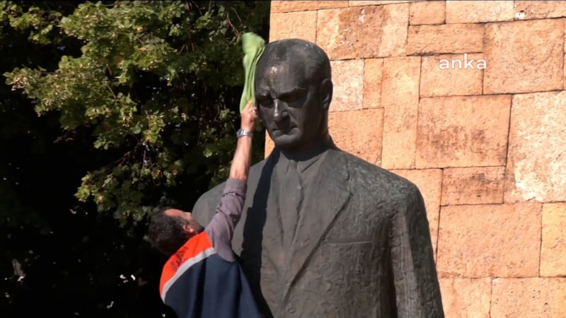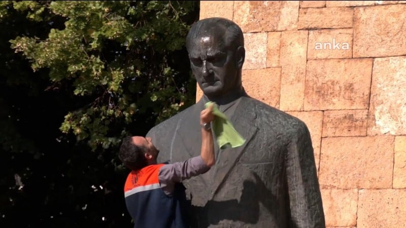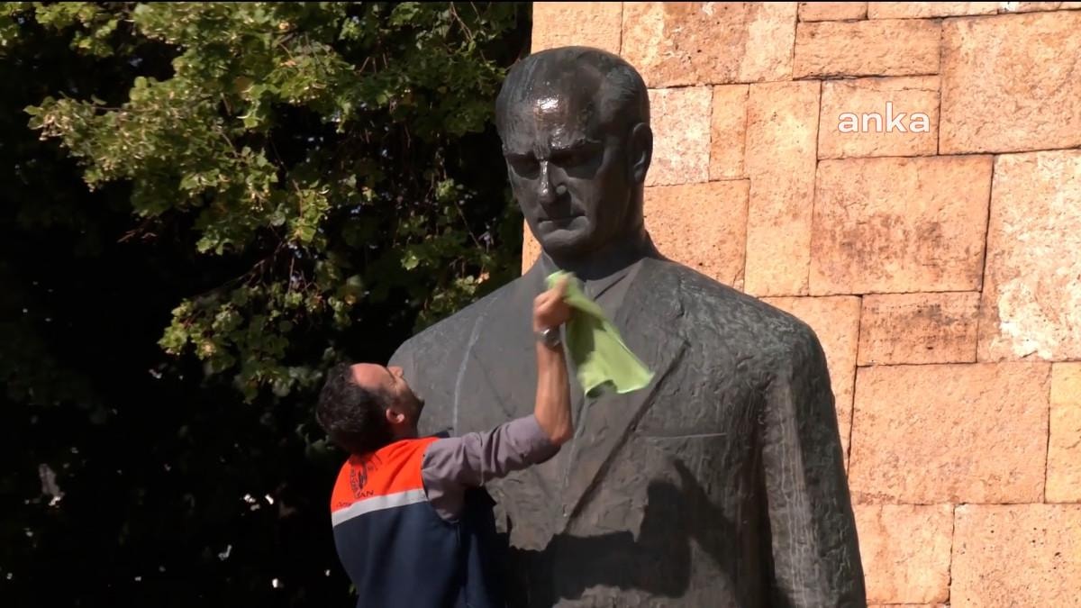 Elindeki bir bez parçasıyla Atatürk Anıtı'nın baş kısmını temizlemeye çalışan bir işçinin görüntüleri, sosyal medyada gündem oldu.