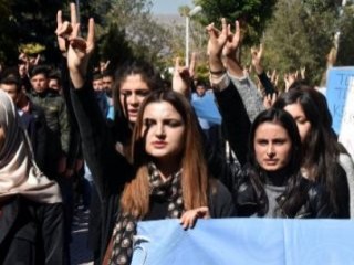 Üniversite kampusünde düzenlenen yürüyüşte ellerinde çeşitli dövizler taşıyan öğrenciler, merkezi kafeterya önünde sloganlarla toplandı.