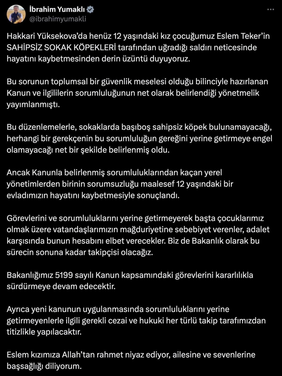 Ancak Kanunla belirlenmiş sorumluluklarından kaçan yerel yönetimlerden birinin sorumsuzluğu maalesef 12 yaşındaki bir evladımızın hayatını kaybetmesiyle sonuçlandı. Görevlerini ve sorumluluklarını yerine getirmeyerek başta çocuklarımız olmak üzere vatandaşlarımızın mağduriyetine sebebiyet verenler, adalet karşısında bunun hesabını elbet verecekler. Biz de Bakanlık olarak bu sürecin sonuna kadar takipçisi olacağız. Bakanlığımız 5199 sayılı Kanun kapsamındaki görevlerini karalılıkla sürdürmeye devam edecektir. Ayrıca yeni kanunun uygulanmasında sorumluluklarını yerine getirmeyenlerle ilgili gerekli cezai ve hukuki her türlü takip tarafımızdan titizlikle yapılacaktır. Eslem kızımıza Allah’tan rahmet niyaz ediyor, ailesine ve sevenlerine başsağlığı diliyorum.