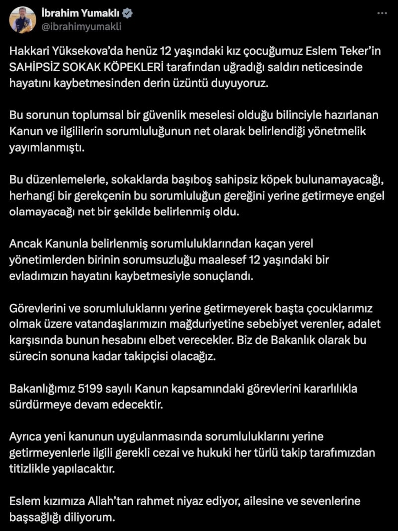 Hakkari Yüksekova'da kütüphaneye gitmek için evinden çıkan 12 yaşındaki Eslem'e sahipsiz köpekler saldırdı. Ağır yaralanan çocuk, hayatını kaybetti. Tarım ve Orman Bakanı İbrahim Yumaklı, bakanlık olarak sürecin takipçisi olacağını belirterek, "Sorumlular, adalet karşısında bunun hesabını elbet verecekler" dedi.