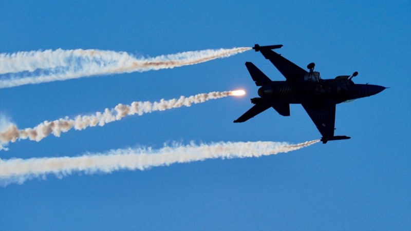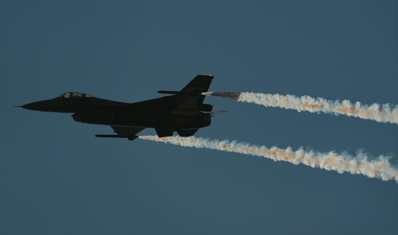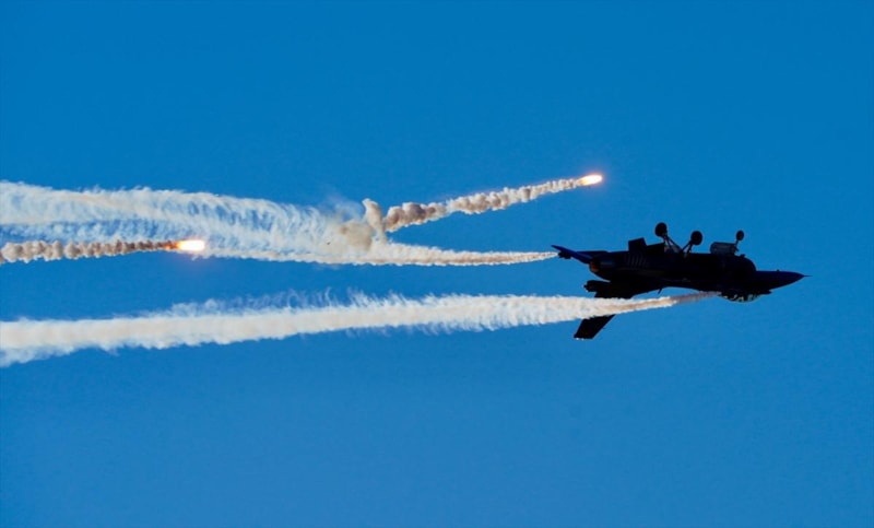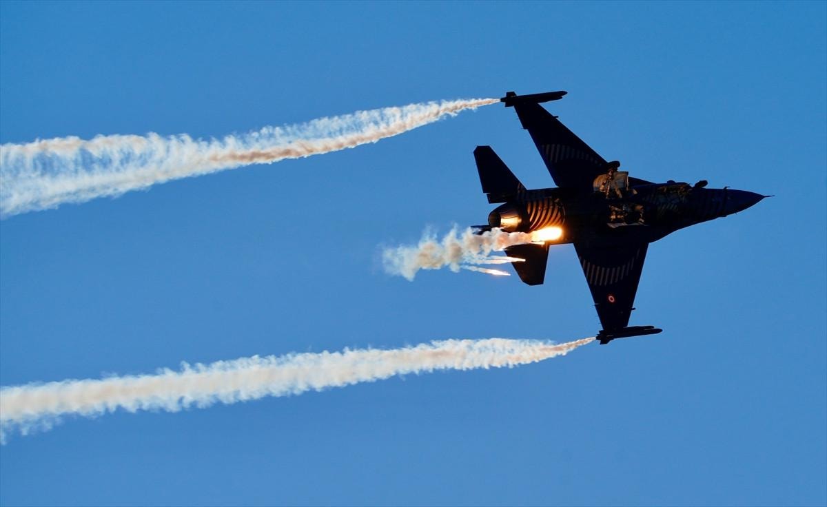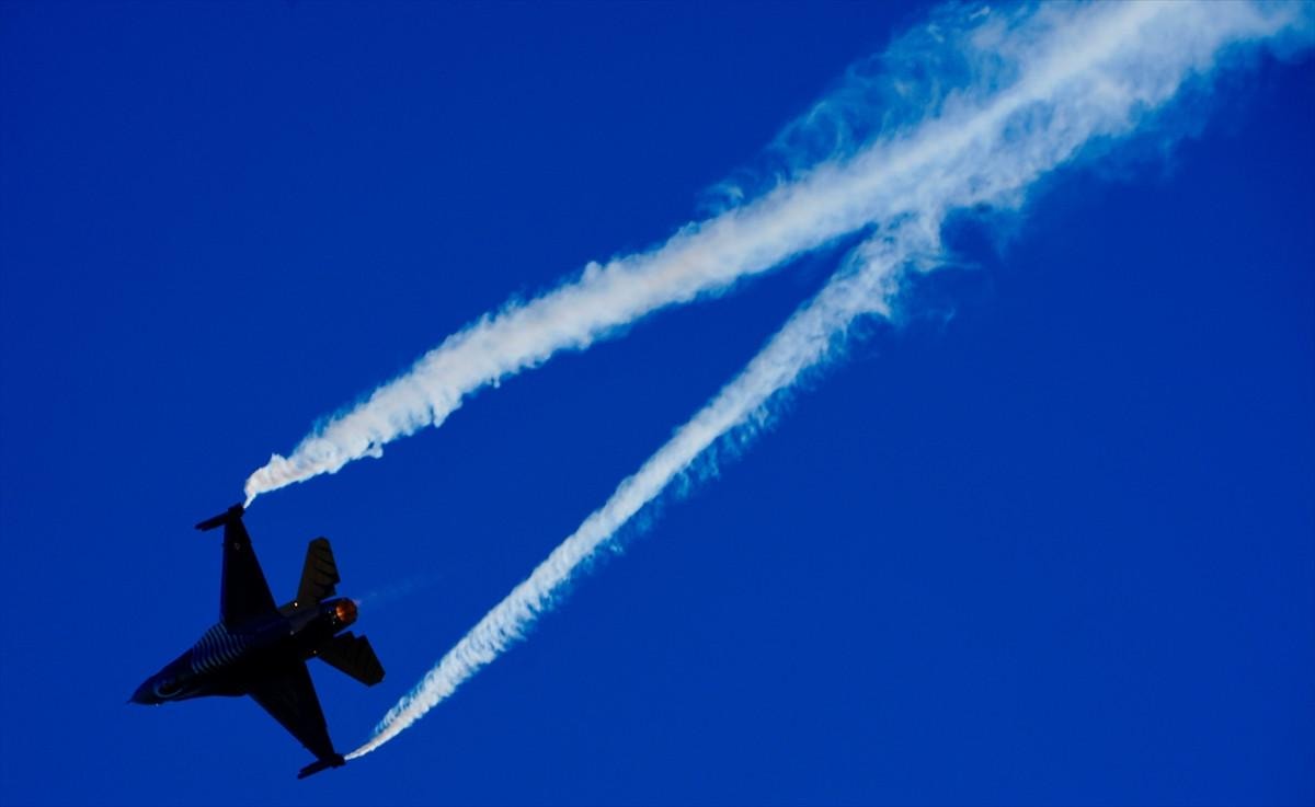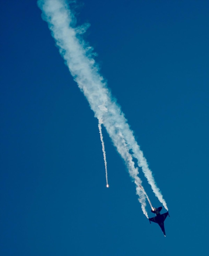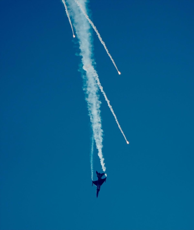 Isı güdümlü füzeleri şaşırtmak için kullanılan alev toplarının da (Flare) atıldığı prova, izleyenlerin nefesini kesti..