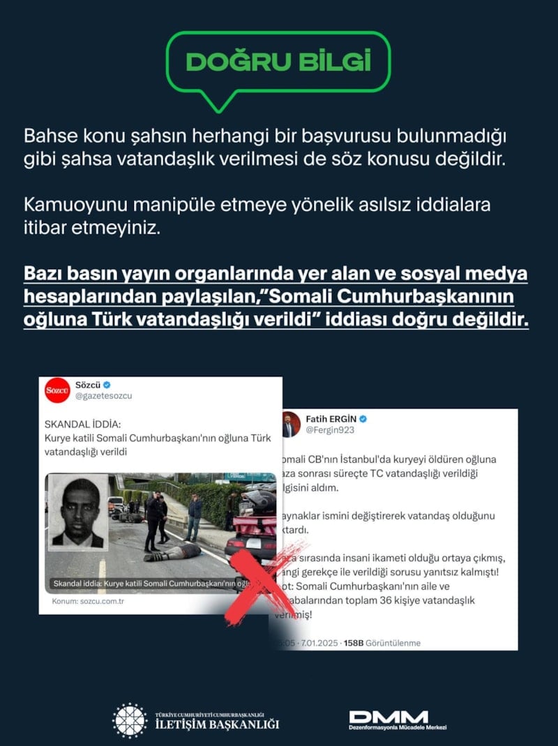 İletişim Başkanlığı Dezenformasyonla Mücadele Merkezi (DMM), bazı basın yayın organlarında paylaşılan, "Somali Cumhurbaşkanının oğluna Türk vatandaşlığı verildiğine" ilişkin iddiaların asılsız olduğunu bildirdi.