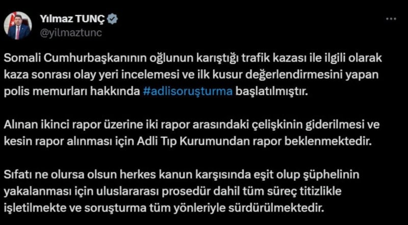 Somali Cumhurbaşkanının oğlunun karıştığı trafik kazası ile ilgili olarak kaza sonrası olay yeri incelemesi ve ilk kusur değerlendirmesini yapan polis memurları hakkında adli soruşturma başlatılmıştır.