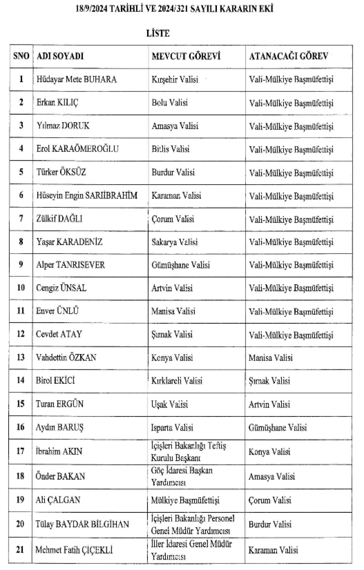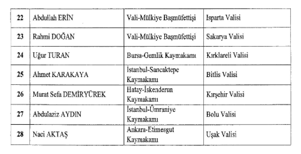 Kararname ile Hüdayar Mete Buhara, Erkan Kılıç, Yılmaz Doruk, Erol Karaömeroğlu, Türker Öksüz, Hüseyin Engin Sarıibrahim, Zülkif Dağlı, Yaşar Karadeniz, Alper Tanrısever, Cengiz Ünsal, Enver Ünlü ve Cevdet Atay "vali-mülkiye başmüfettişliği" görevine getirildi.