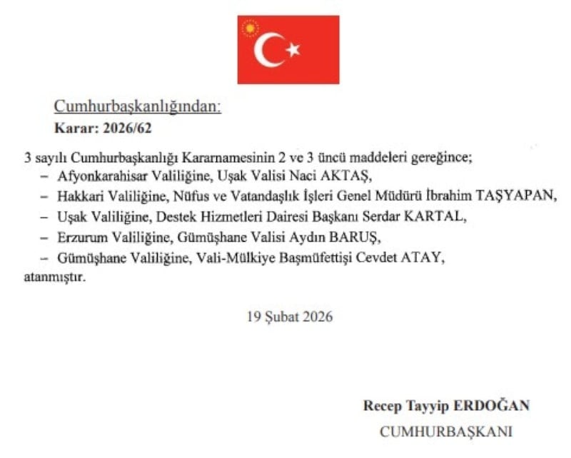 Cumhurbaşkanlığı kararıyla Afyonkarahisar, Uşak, Hakkari, Erzurum ve Gümüşhane valiliklerine yeni atamalar yapıldı. Adalet Bakanlığı ve İçişleri Bakanlığı bakan yardımcılıklarına ilişkin atama ve görevden alma kararları Resmi Gazete'de yayımlandı.
