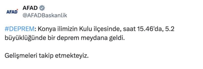 "Konya Kulu’da 5.2 büyüklüğünde bir deprem meydan gelmiştir. Çevre illerden de hissedilen depremle ilgili olarak, AFAD ve ilgili kurumlarımızın tüm ekipleri derhal saha taramalarına başlamıştır. An itibarıyla herhangi olumsuz bir durum bulunmamaktadır.