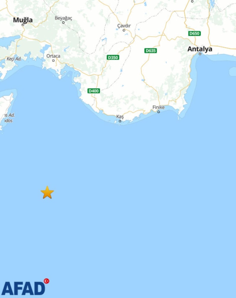Saat 19.54 sıralarında yaşanan 4.7 büyüklüğündeki deprem, Kaş ilçesine 113.96 kilometre uzaklığında meydana geldi.