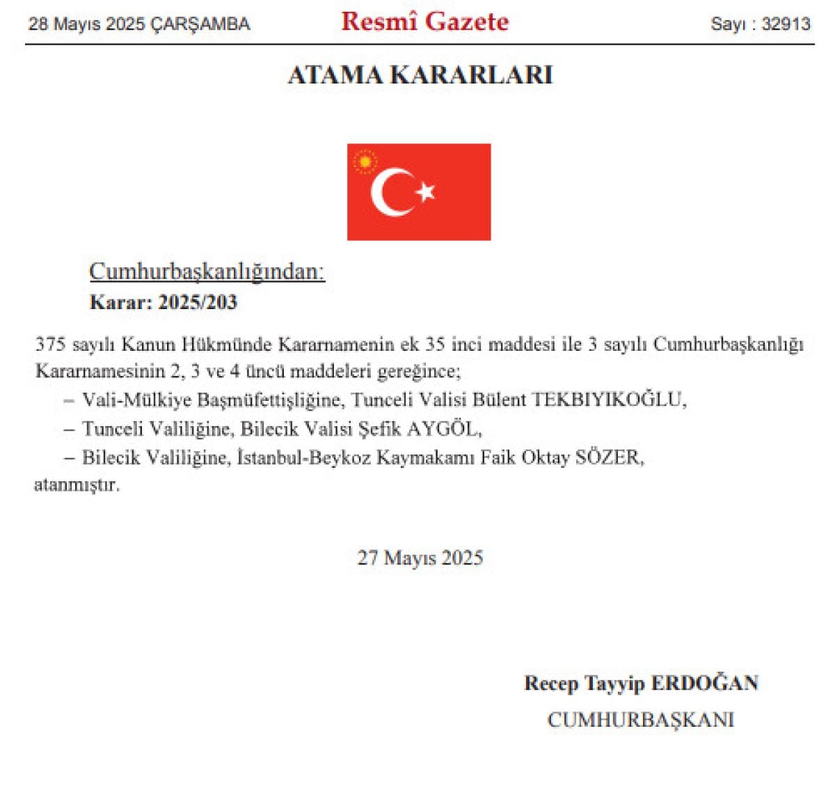 Tunceli Valiliğine Bilecik Valisi Şefik Aygöl, Bilecik Valiliğine ise İstanbul Beykoz Kaymakamı Faik Oktay Sözer atandı.