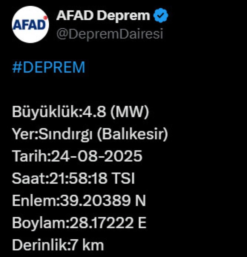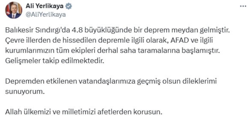 Yerlikaya, "Balıkesir Sındırgı'da 4.8 büyüklüğünde bir deprem meydan gelmiştir. Çevre illerden de hissedilen depremle ilgili olarak, AFAD ve ilgili kurumlarımızın tüm ekipleri derhal saha taramalarına başlamıştır. Gelişmeler takip edilmektedir." dedi.