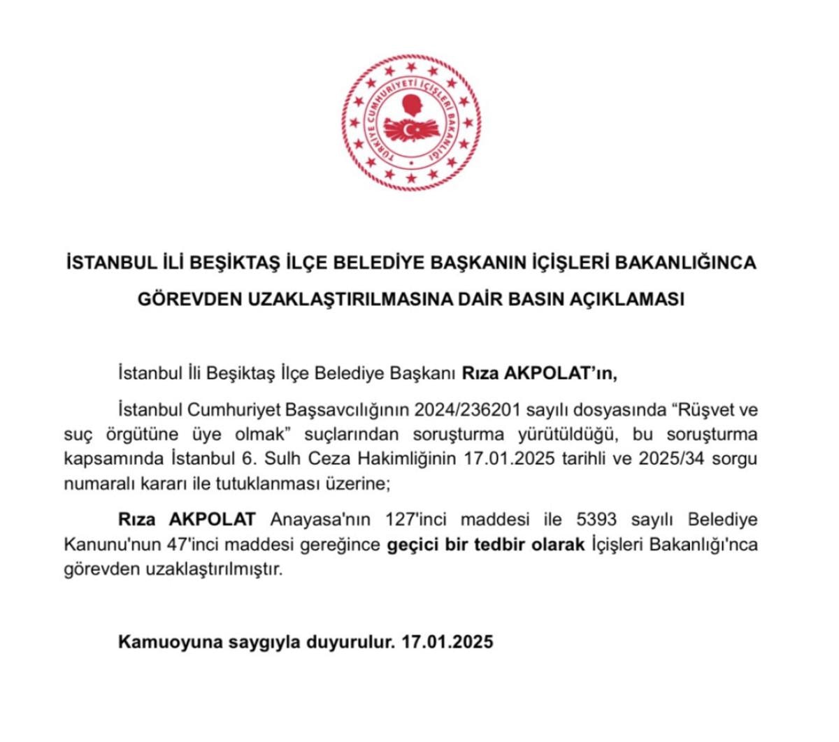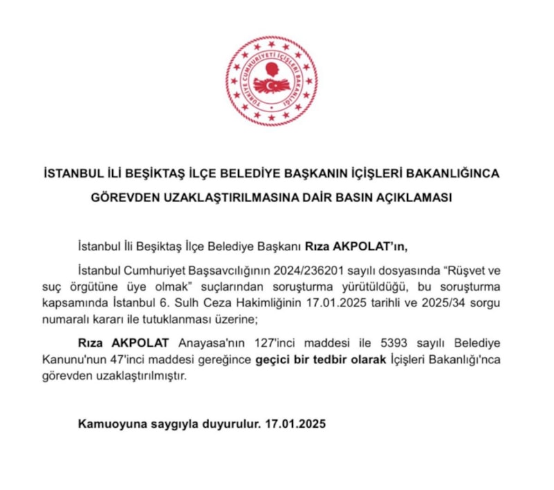 Açıklamada, İstanbul 6. Sulh Ceza Hakimliğinin 17 Ocak 2025 tarihli ve 2025/34 sorgu numaralı kararına dayanarak tutuklanan Rıza Akpolat'ın, Anayasa'nın 127'nci maddesi ve 5393 sayılı Belediye Kanunu'nun 47'nci maddesi gereği İçişleri Bakanlığı tarafından geçici olarak görevden uzaklaştırıldığı ifade edildi.