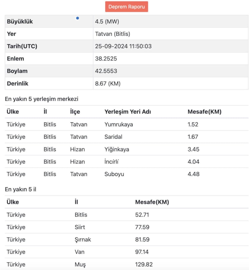 AFAD tarafından yapılan paylaşımda, Bitlis'in Tatvan ilçesinde saat 14.50'de deprem meydana geldiği bildirildi.