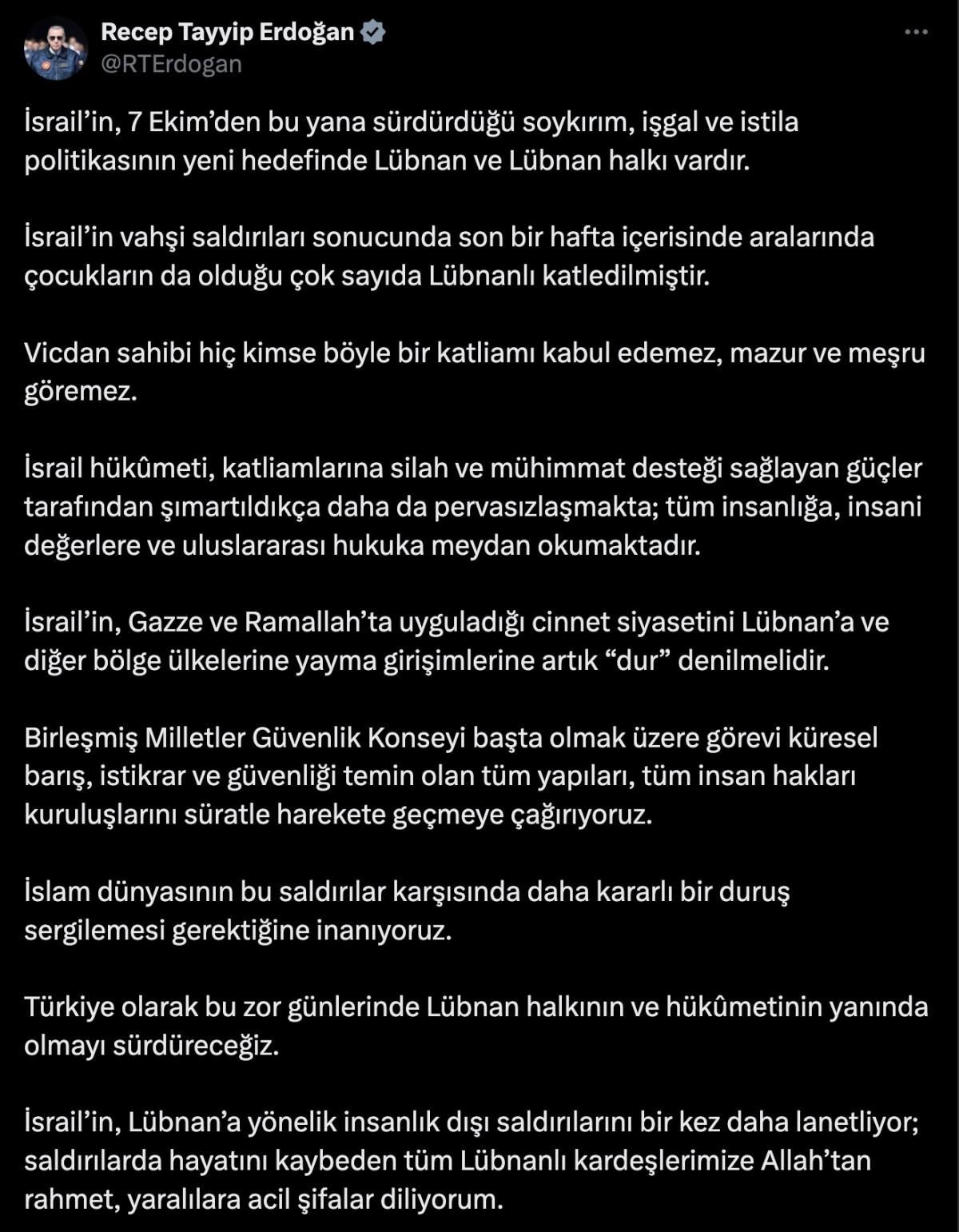 "İsrail'in, 7 Ekim'den bu yana sürdürdüğü soykırım, işgal ve istila politikasının yeni hedefinde Lübnan ve Lübnan halkı vardır. İsrail'in vahşi saldırıları sonucunda son bir hafta içerisinde aralarında çocukların da olduğu çok sayıda Lübnanlı katledilmiştir. Vicdan sahibi hiç kimse böyle bir katliamı kabul edemez, mazur ve meşru göremez. İsrail hükümeti, katliamlarına silah ve mühimmat desteği sağlayan güçler tarafından şımartıldıkça daha da pervasızlaşmakta, tüm insanlığa, insani değerlere ve uluslararası hukuka meydan okumaktadır."