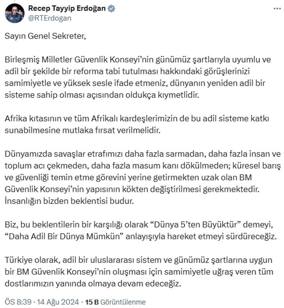 Birleşmiş Milletler Güvenlik Konseyi’nin günümüz şartlarıyla uyumlu ve adil bir şekilde bir reforma tabi tutulması hakkındaki görüşlerinizi samimiyetle ve yüksek sesle ifade etmeniz, dünyanın yeniden adil bir sisteme sahip olması açısından oldukça kıymetlidir.