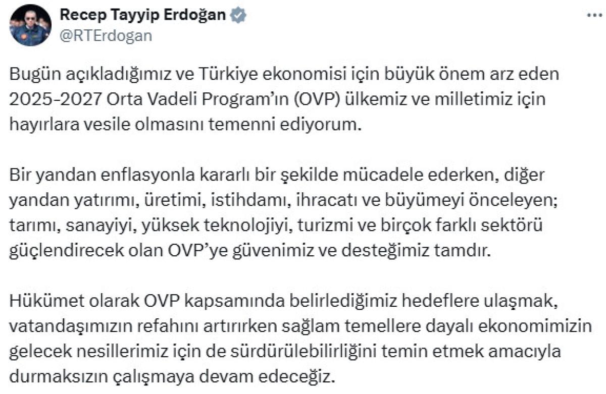 Bugün açıkladığımız ve Türkiye ekonomisi için büyük önem arz eden 2025-2027 Orta Vadeli Program’ın (OVP) ülkemiz ve milletimiz için hayırlara vesile olmasını temenni ediyorum.