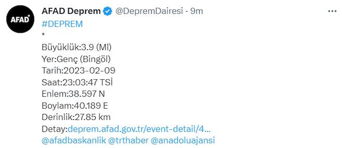AFAD'tan gelen bilgiye göre Bingöl'ün Genç ilçesinde 3.9 büyüklüğünde deprem meydana geldi.