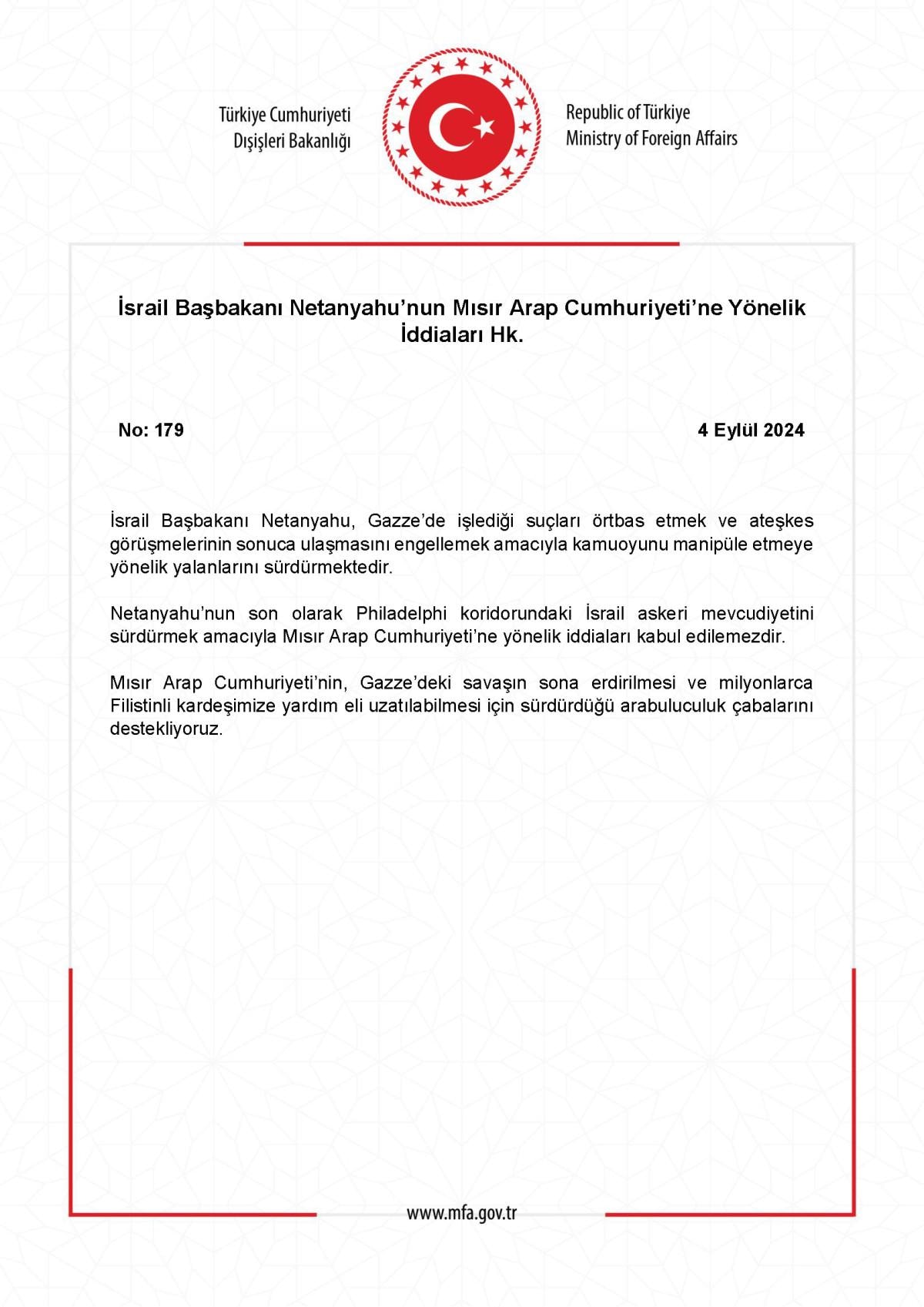 Netanyahu’nun son olarak Philadelphi koridorundaki İsrail askeri mevcudiyetini sürdürmek amacıyla Mısır Arap Cumhuriyeti’ne yönelik iddialarının kabul edilemez olduğu belirtildi.