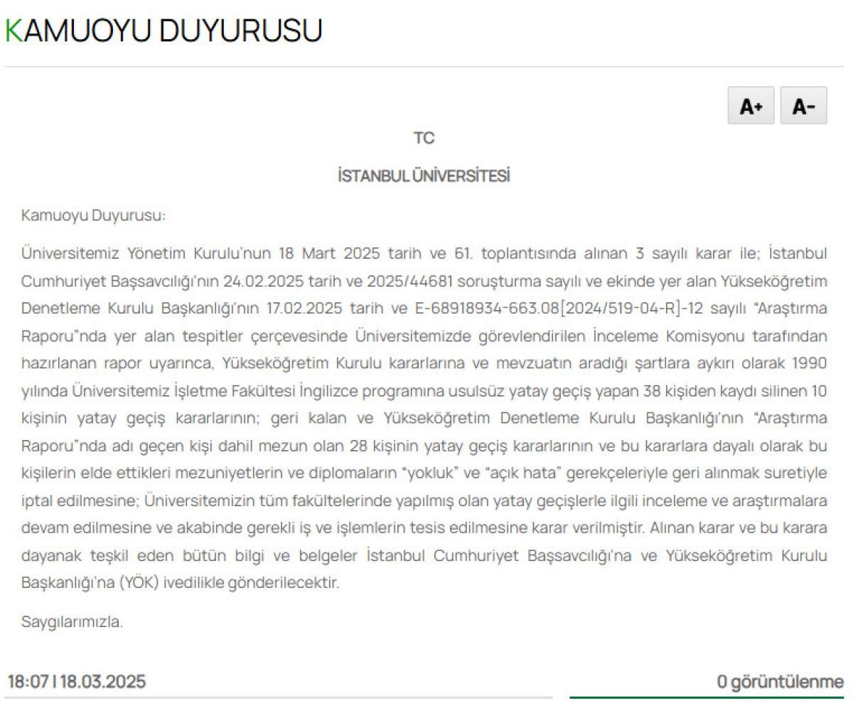 Üniversitemiz Yönetim Kurulu’nun 18 Mart 2025 tarih ve 61. toplantısında alınan 3 sayılı karar ile; İstanbul Cumhuriyet Başsavcılığı'nın 24.02.2025 tarih ve 2025/44681 soruşturma sayılı ve ekinde yer alan Yükseköğretim Denetleme Kurulu Başkanlığı'nın 17.02.2025 tarih ve E-68918934-663.08[2024/519-04-R]-12 sayılı “Araştırma Raporu”nda yer alan tespitler çerçevesinde Üniversitemizde görevlendirilen İnceleme Komisyonu tarafından hazırlanan rapor uyarınca, Yükseköğretim Kurulu kararlarına ve mevzuatın aradığı şartlara aykırı olarak 1990 yılında Üniversitemiz İşletme Fakültesi İngilizce programına usulsüz yatay geçiş yapan 38 kişiden kaydı silinen 10 kişinin yatay geçiş kararlarının; geri kalan ve Yükseköğretim Denetleme Kurulu Başkanlığı'nın “Araştırma Raporu”nda adı geçen kişi dahil mezun olan 28 kişinin yatay geçiş kararlarının ve bu kararlara dayalı olarak bu kişilerin elde ettikleri mezuniyetlerin ve diplomaların “yokluk” ve “açık hata” gerekçeleriyle geri alınmak suretiyle iptal edilmesine; Üniversitemizin tüm fakültelerinde yapılmış olan yatay geçişlerle ilgili inceleme ve araştırmalara devam edilmesine ve akabinde gerekli iş ve işlemlerin tesis edilmesine karar verilmiştir.