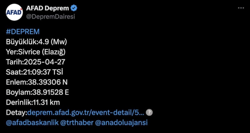 Paylaşımında, merkez üssü Sivrice olan depremin 4.9 büyüklüğünde gerçekleştiğini bildirdi.