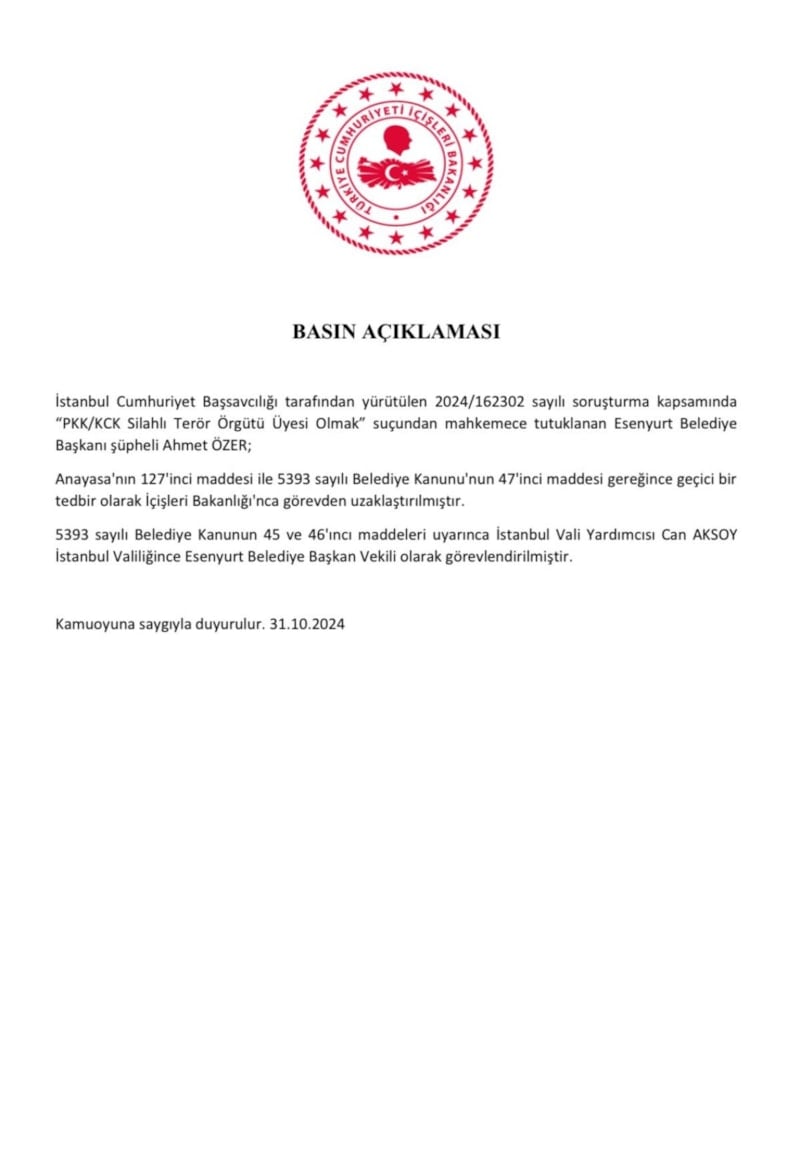 İstanbul Cumhuriyet Başsavcılığı tarafından yürütülen 2024/162302 sayılı soruşturma kapsamında “PKK/KCK Silahlı Terör Örgütü Üyesi Olmak” suçundan mahkemece tutuklanan Esenyurt Belediye Başkanı şüpheli Ahmet ÖZER; Anayasa'nın 127'inci maddesi ile 5393 sayılı Belediye Kanunu'nun 47'inci maddesi gereğince geçici bir tedbir olarak İçişleri Bakanlığı'nca görevden uzaklaştırılmıştır. 5393 sayılı Belediye Kanunun 45 ve 46'ıncı maddeleri uyarınca İstanbul Vali Yardımcısı Can AKSOY İstanbul Valiliğince Esenyurt Belediye Başkan Vekili olarak görevlendirilmiştir. Kamuoyuna saygıyla duyurulur.