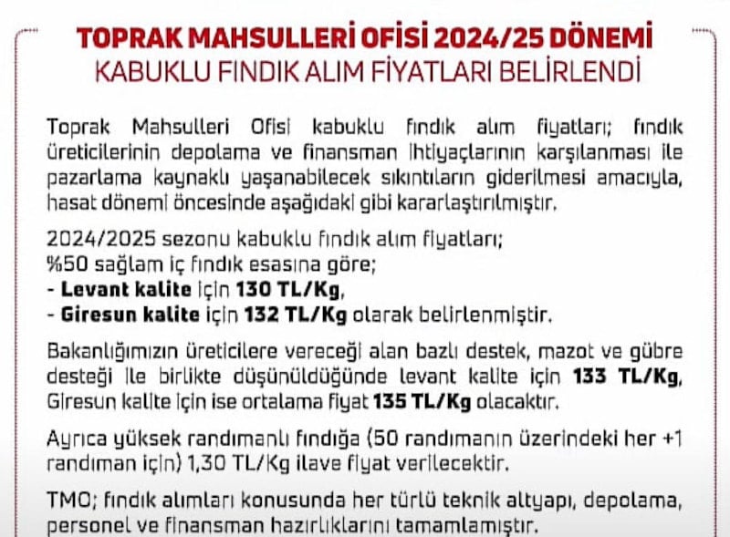 Bakanlığımızın üreticilere vereceği alan bazlı destek, mazot ve gübre desteği ile birlikte düşünüldüğünde ise Levant kalite için ortalama fiyat 133 TL/kilogram, Giresun kalite için ise 135 TL/kilogram olacaktır.