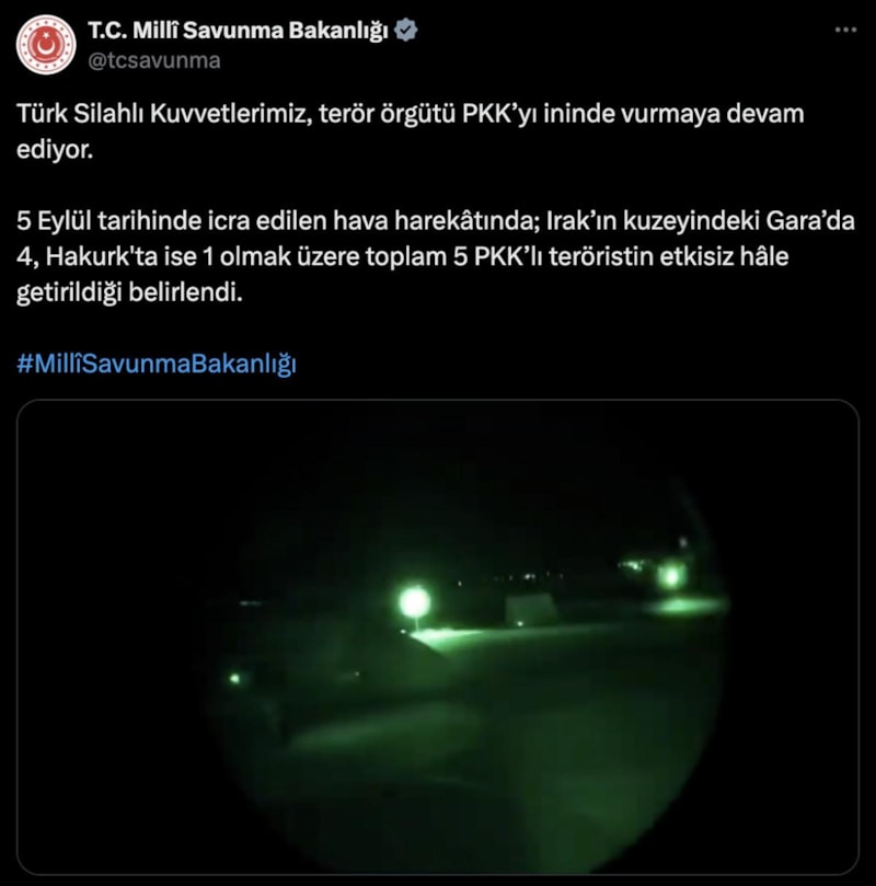 5 Eylül tarihinde icra edilen hava harekâtında; Irak’ın kuzeyindeki Gara’da 4, Hakurk'ta ise 1 olmak üzere toplam 5 PKK’lı teröristin etkisiz hâle getirildiği belirlendi.