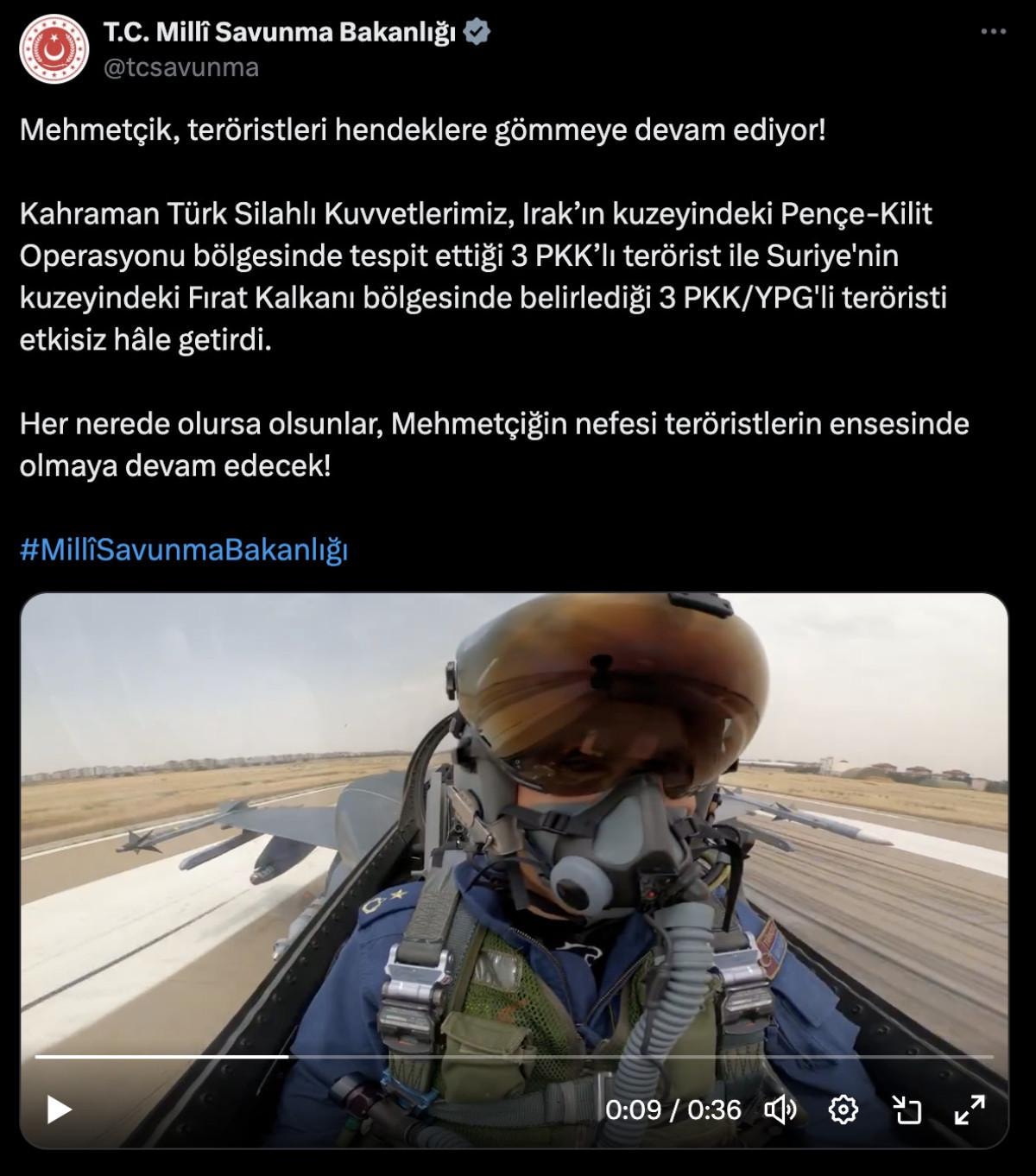 Milli Savunma Bakanlığı'ndan yapılan açıklamada, "Mehmetçik, teröristleri hendeklere gömmeye devam ediyor. Kahraman Türk Silahlı Kuvvetlerimiz, Irak’ın kuzeyindeki Pençe-Kilit Operasyonu bölgesinde tespit ettiği 3 PKK’lı terörist ile Suriye'nin kuzeyindeki Fırat Kalkanı bölgesinde belirlediği 3 PKK/YPG'li teröristi etkisiz hâle getirdi. Her nerede olursa olsunlar, Mehmetçiğin nefesi teröristlerin ensesinde olmaya devam edecek." ifadelerine yer verildi.