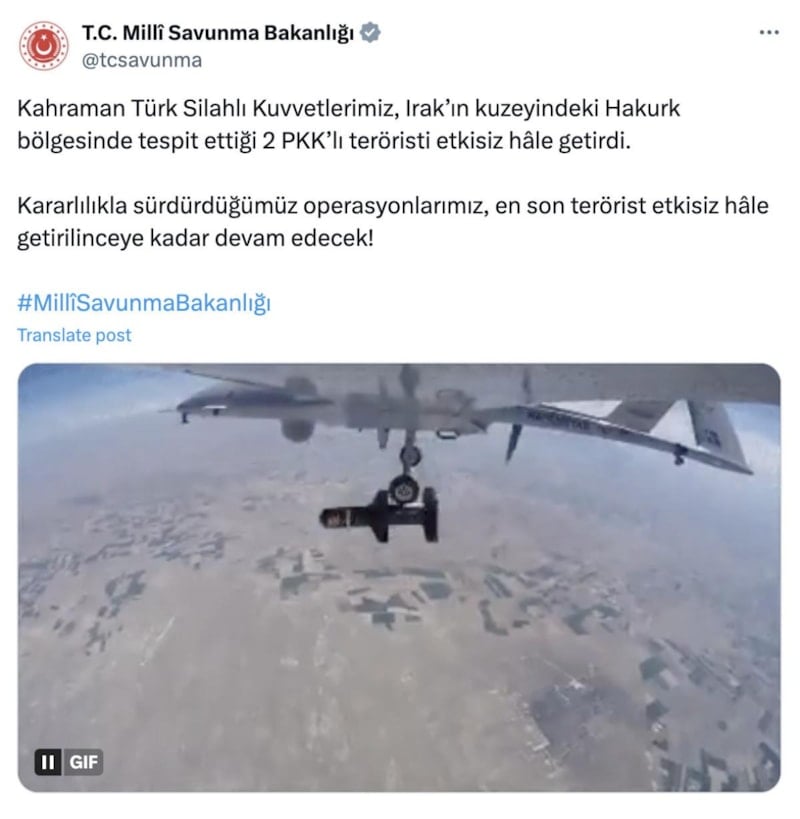 Milli Savunma Bakanlığı, Irak'ın kuzeyindeki Hakurk bölgesinde tespit edilen 2 PKK'lı teröristin etkisiz hale getirildiğini duyurdu.