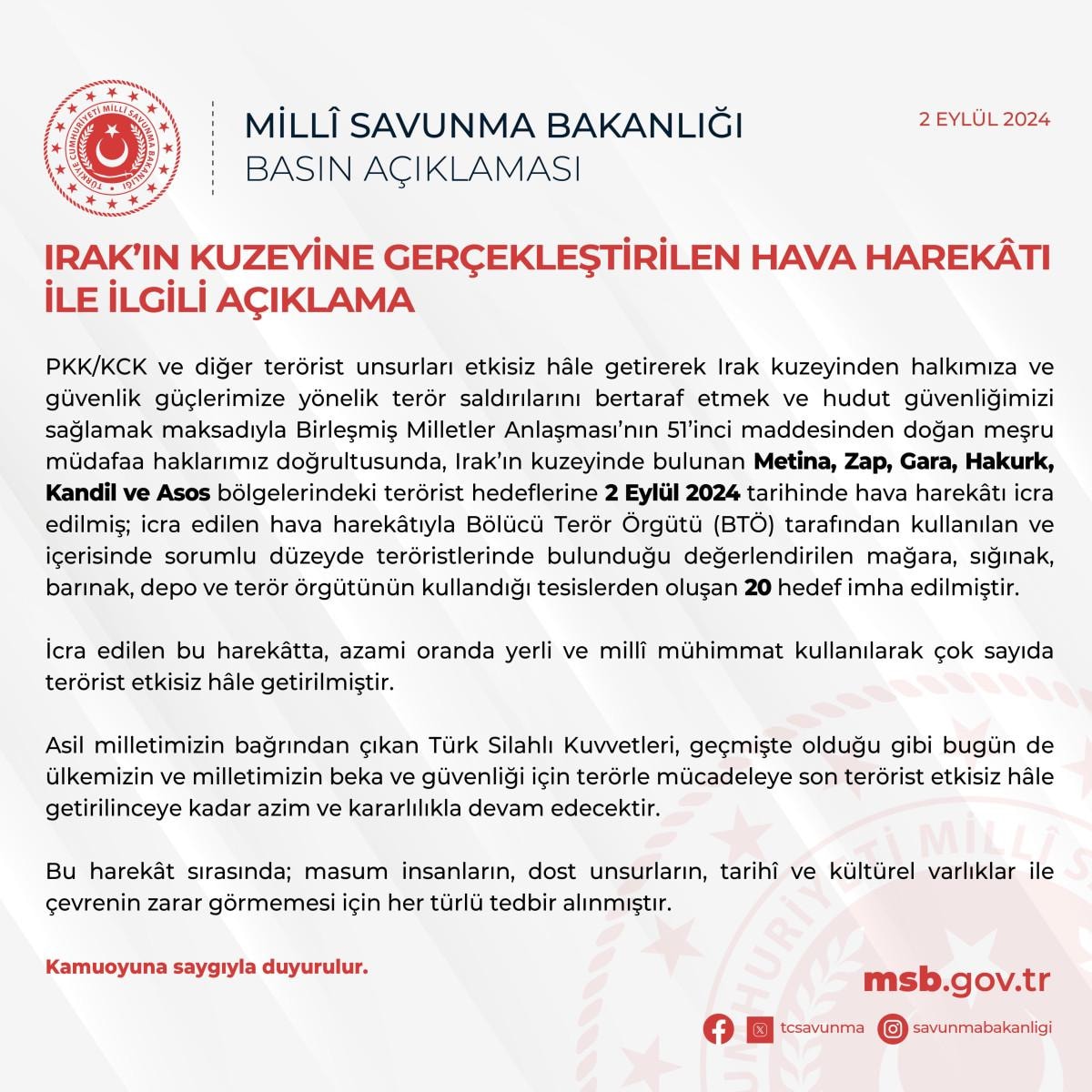 Milli Savunma Bakanlığı (MSB) tarafından yapılan açıklamada, Irak'ın kuzeyindeki Metina, Gara, Hakurk, Kandil ve Asos bölgelerinde yapılan hava harekatında 20 terör hedefinin daha vurularak imha edildiği duyuruldu..