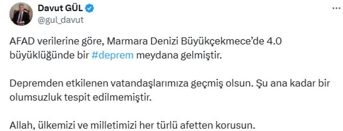 İstanbul Valisi Davut Gül, depremle ilgili yaptığı açıklamasında kent genelinde herhangi bir olumsuzluk tespit edilmediğini açıkladı.