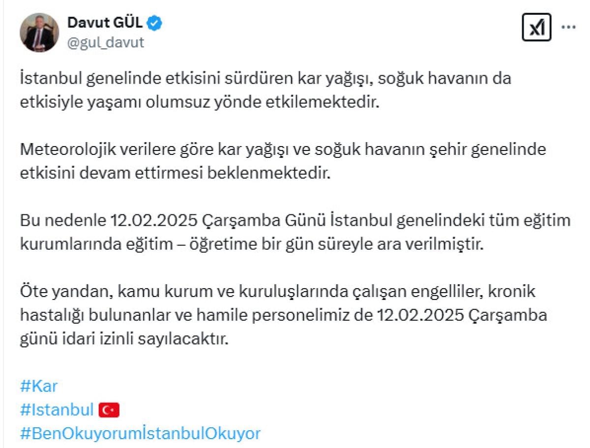 Bu nedenle 12.02.2025 Çarşamba Günü İstanbul genelindeki tüm eğitim kurumlarında eğitim – öğretime bir gün süreyle ara verilmiştir.