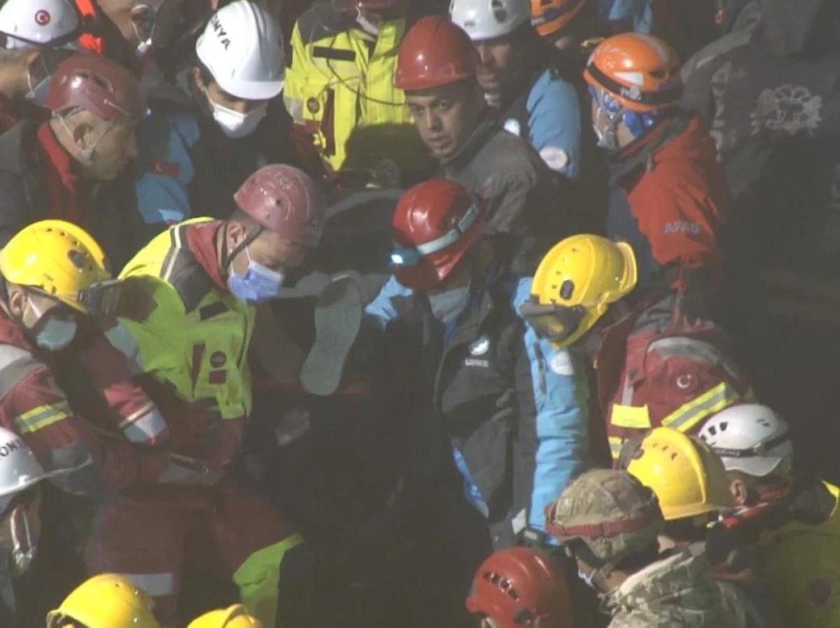 Enkaz üzerindeki kurtarma ekipleri, koridor oluşturarak enkazdan 3 kişiyi sedyeyle çıkardı.