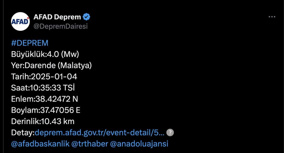 AFAD'ın internet sitesinde yer alan bilgiye göre, merkez üssü Malatya Darende olan 4 büyüklüğünde sarsıntı kaydedildi.