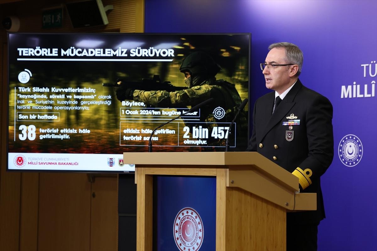 Milli Savunma Bakanlığı (MSB) Basın ve Halkla İlişkiler Müşaviri Tuğamiral Zeki Aktürk, Irak ve Suriye'nin kuzeyinde son bir haftada 38 teröristin etkisiz hale getirildiğini bildirerek, Irak ve Suriye'nin kuzeyinde gerçekleştirilen terörle mücadele operasyonlarına ilişkin şöyle konuştu: