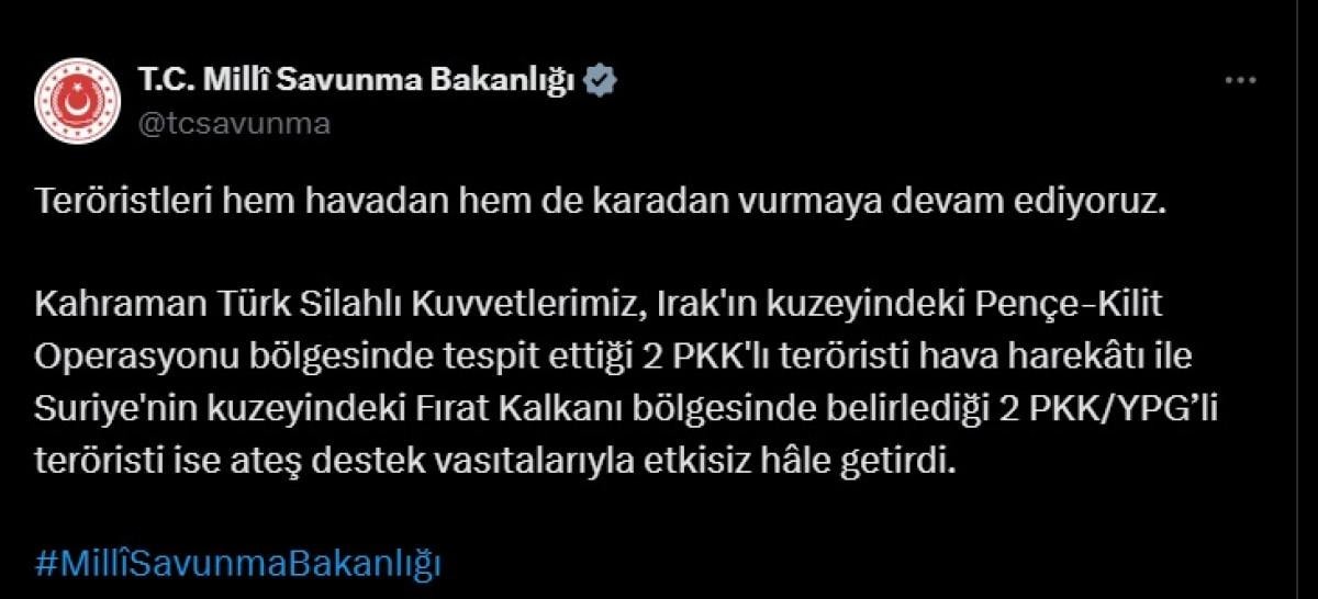 Kahraman Türk Silahlı Kuvvetlerimiz, Irak'ın kuzeyindeki Pençe-Kilit Operasyonu bölgesinde tespit ettiği 2 PKK'lı teröristi hava harekâtı ile Suriye'nin kuzeyindeki Fırat Kalkanı bölgesinde belirlediği 2 PKK/YPG’li teröristi ise ateş destek vasıtalarıyla etkisiz hâle getirdi.