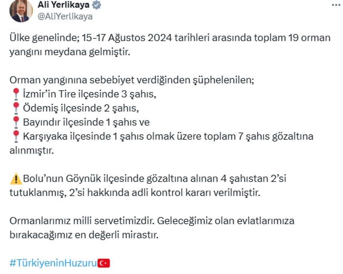 Son dakika haberine göre, İçişleri Bakanı Ali Yerlikaya İzmir'de çıkan yangınlardan sorumlu tutulan 7 şüphelinin gözaltına alındığını, Bolu'daki yangınla ilgili ise 4 kişiden 2'sinin tutuklandığını duyurdu.