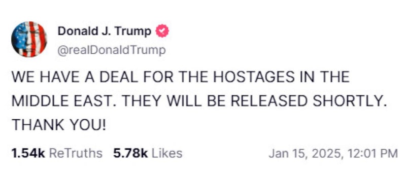Sosyal medya hesabından paylaşımda bulunan Trump, rehineler için anlaşma sağlandığını bildirdi.