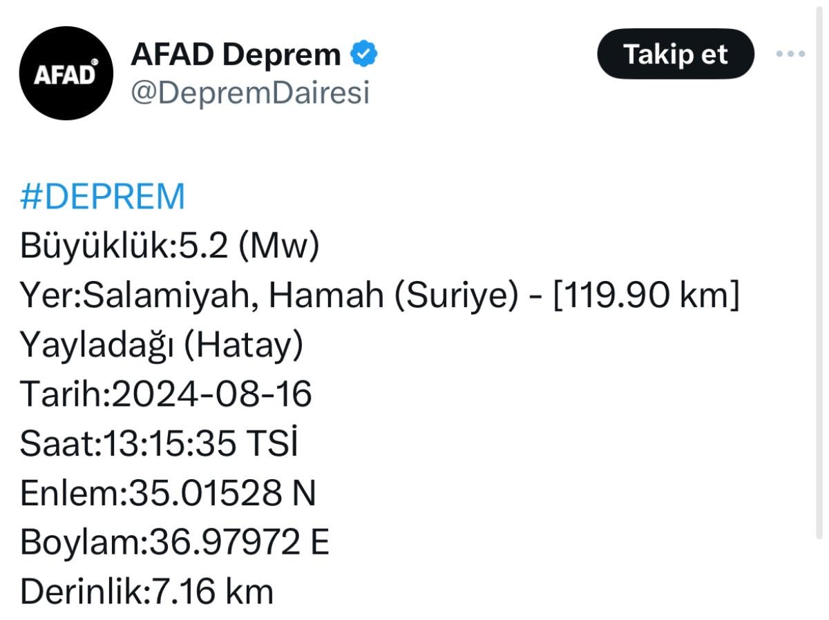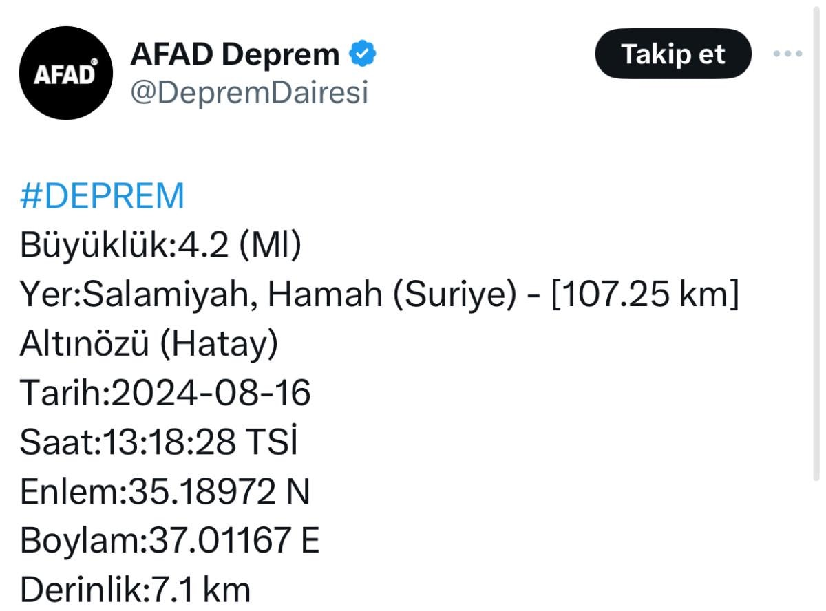 Bu depremin ise Hatay'ın Altınözü ilçesine 107,25 kilometre mesafede olduğu kaydedildi.