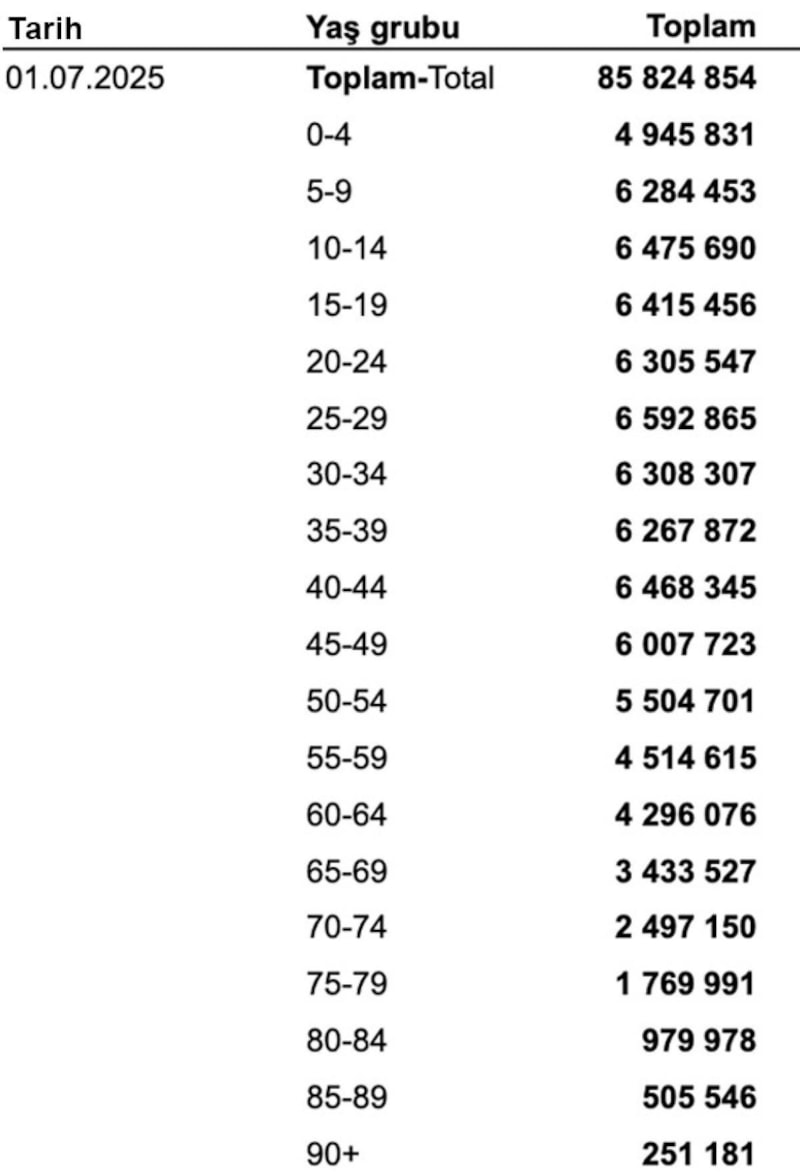 Buna göre, Türkiye'nin nüfusu 2025 yılının ilk altı aylık döneminde 159 bin 910 kişi artarak 1 Temmuz 2025 tarihi itibarıyla 85 milyon 824 bin 854 kişi oldu.