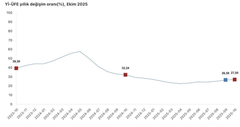Yİ-ÜFE 2025 yılı Ekim ayında; bir önceki aya göre yüzde 1,63 artış, bir önceki yılın Aralık ayına göre yüzde 25,67 artış, bir önceki yılın aynı ayına göre yüzde 27,00 artış ve on iki aylık ortalamalara göre yüzde 25,49 artış gösterdi.