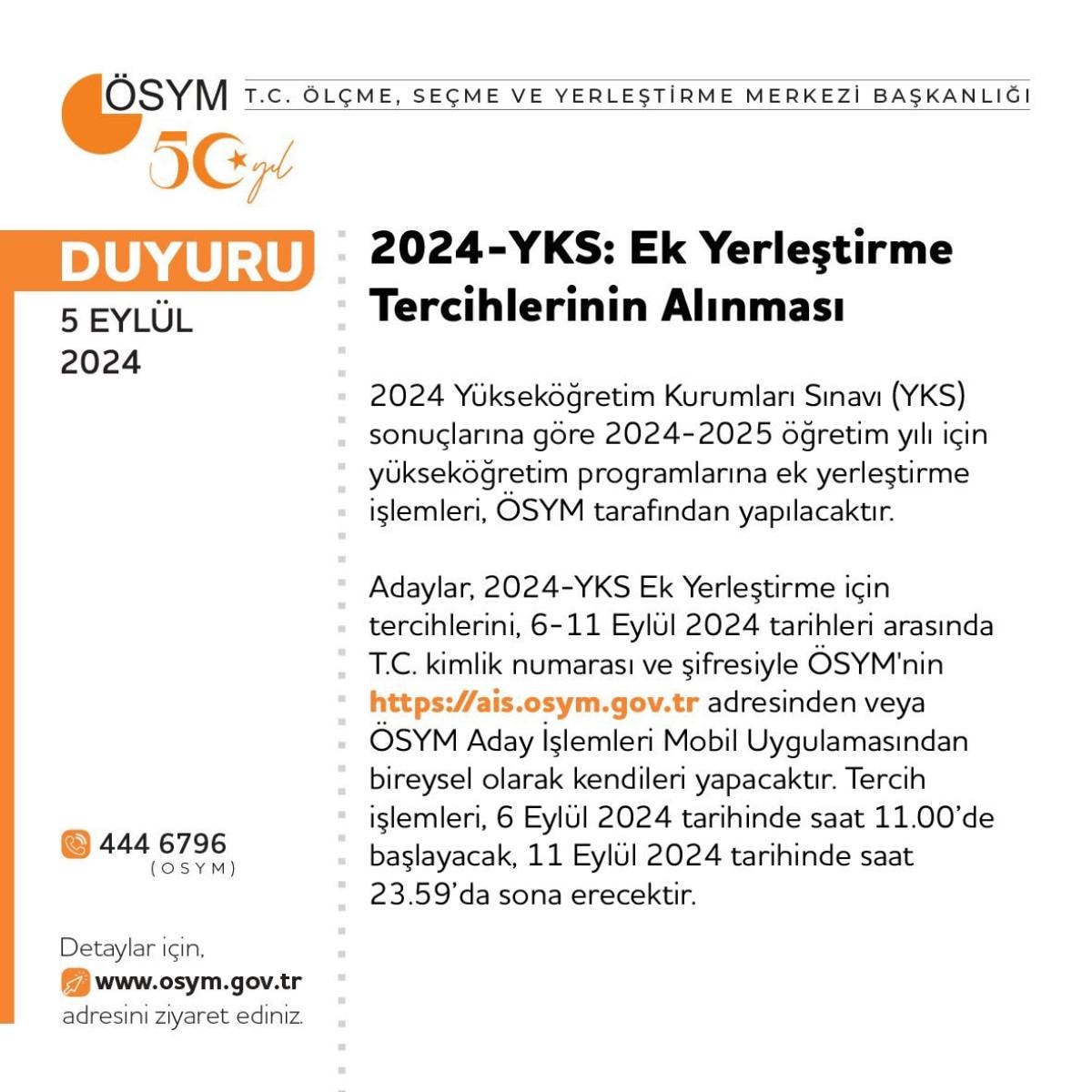ÖSYM tarafından yapılan paylaşımda, YKS ek yerleştirme tercihleri, 6 Eylül 2024 tarihinde saat 11.00'da başlayacağı duyuruldu.