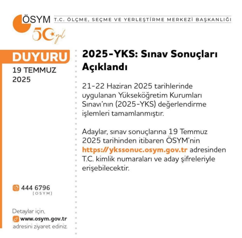 Ölçme, Seçme ve Yerleştirme Merkezi (ÖSYM) Başkanı Bayram Ali Ersoy, 2025-YKS sonuçlarının "ykssonuc.osym.gov.tr" internet adresinden açıklandığını bildirdi.